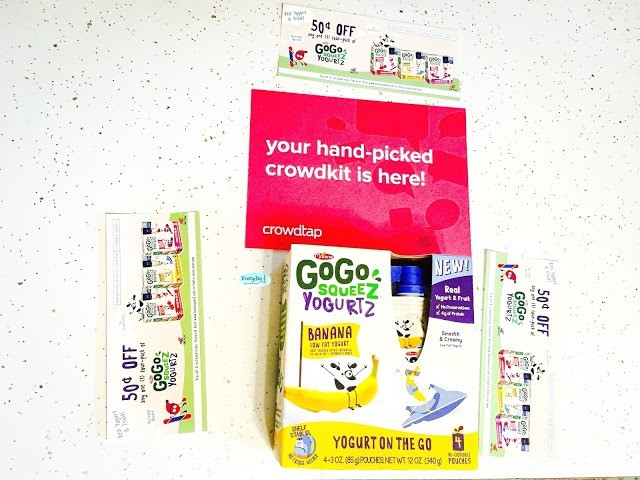 The picture below shows the crowdtap kit given to me for free which was the box of 4 pouches of banana Gogo SqueeZ YogurtZ and three coupons of 50 cents off.