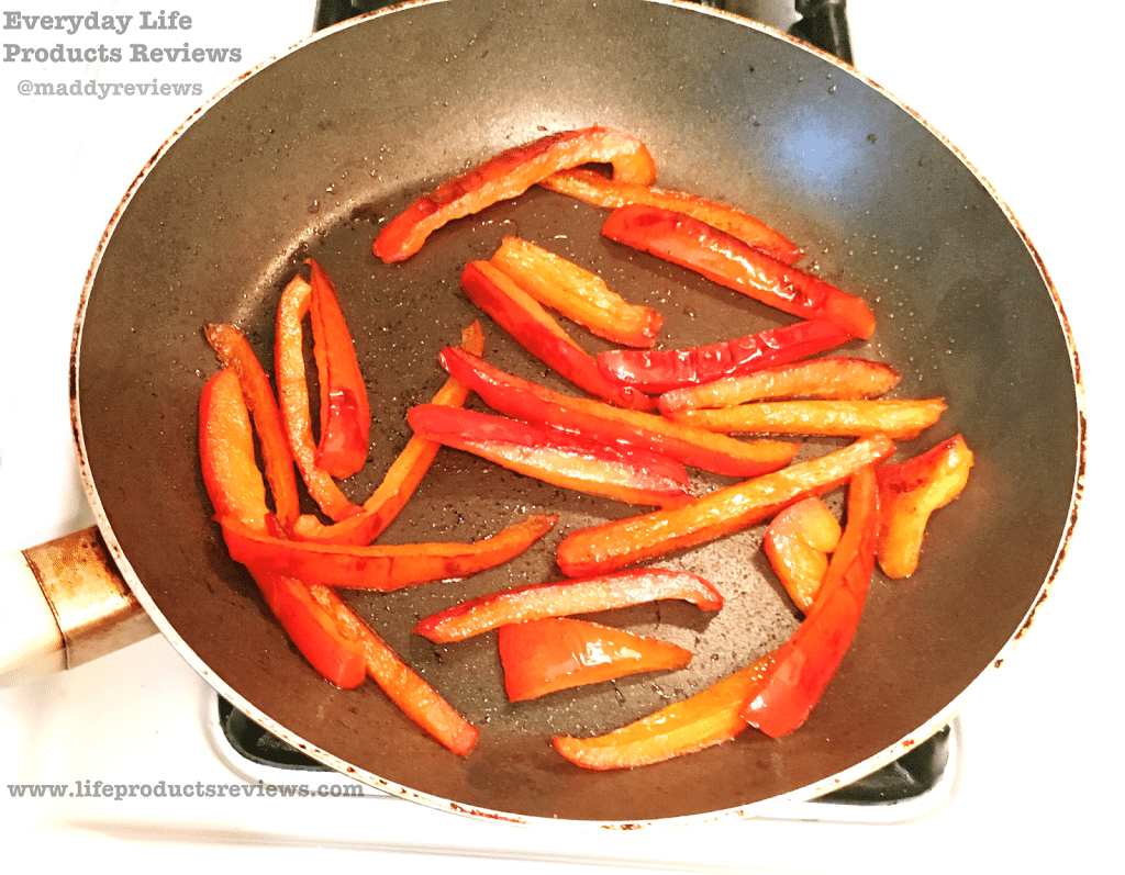 - With a tablespoon of oil in the pan, put in your julienne cut red peppers