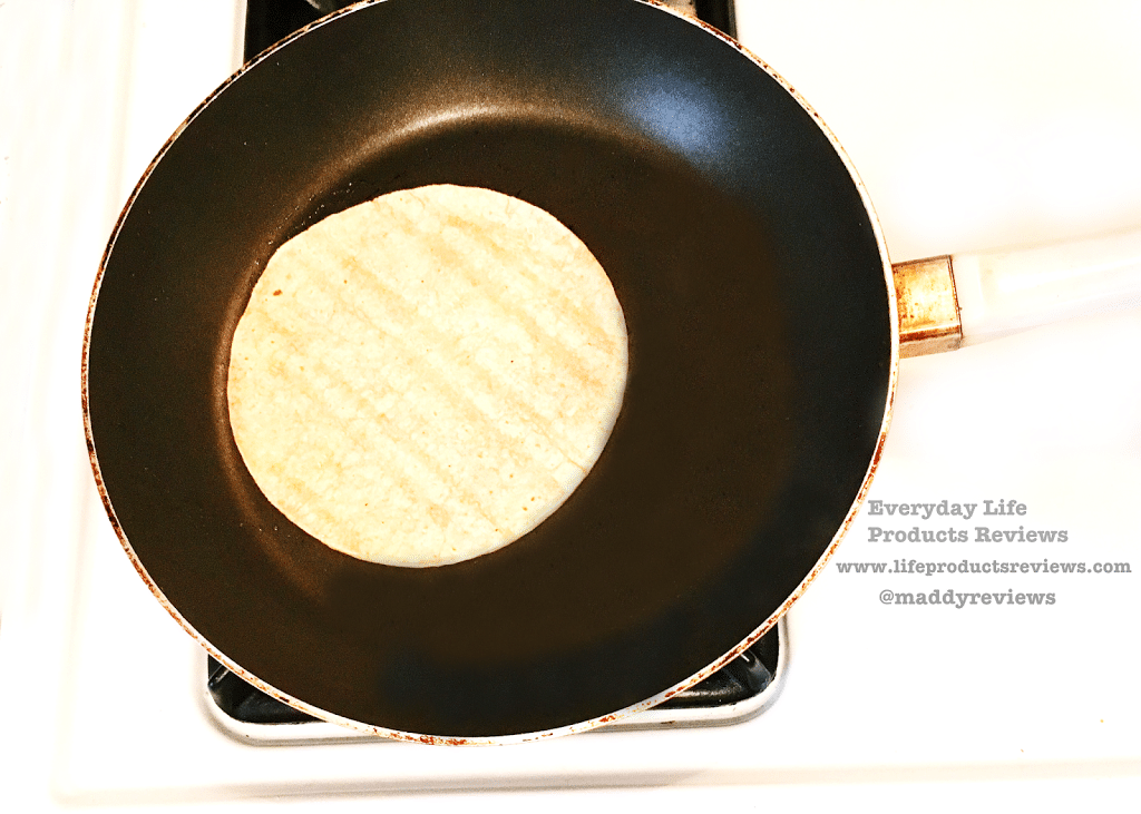 - Put the tortilla into the pan and heat for 30 seconds each side